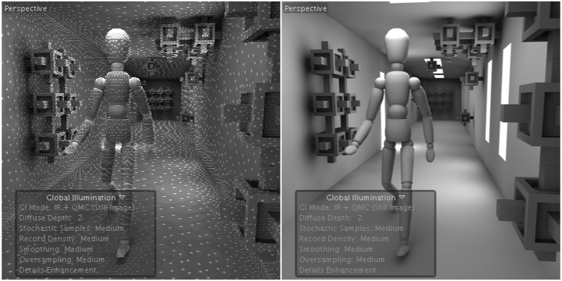 Once you have selected the right choice of Still Image, Camera or Full Animation mode for the scene you will render, it is time to set the stochastic sampling, record density, interpolation and smoothing settings that will determine the overall quality of your GI cache. The settings that determine the placement of records and their stochastic quality are shown below (Image_23). |