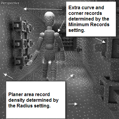 Image_27 Minimum radius determines how many extra records will be added to corners, crevices, curving surfaces and other areas where geometries intersect. The lower this value, the more additional records will be added to these areas (Image_27). This value is a ratio product of the previous Radius value. This means that lowering the Radius value will also create more corner records. Therefore, as the Radius value is lowered (producing more overall records), the Minimum Radius (which produces more additional records in corners) can sometimes be increased (for fewer additional records) because as overall record density increases, fewer corner records may be needed. Overall, it's very easy to become confused here because lower values mean more records, and vice versa, exactly the opposite to how the corresponding settings of the old GI worked. The image below (Image_28) shows the areas affected by the Radius and Minimum Radius settings. |
