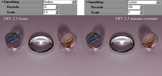 Smoothing is the compliment to interpolation and can be used to smooth (some might say blur) an area of densely packed records which is useful for reducing the noise that can easily result from higher record densities having insufficient stochastic quality to blend seamlessly themselves. The cats eye marble image (Image_18) above was rendered originally using medium smoothing, but after the render was finished I discovered unwanted noise from the high record count I had used. The GI prepass cache render had taken 2.5 hours, but since it was saved it could be reused with a higher smoothing value. Rerendering the image with the new smoothing values took only a matter of minutes then since the cache did not have to be rerendered. A comparison of the two renders is shown below (Image_32).