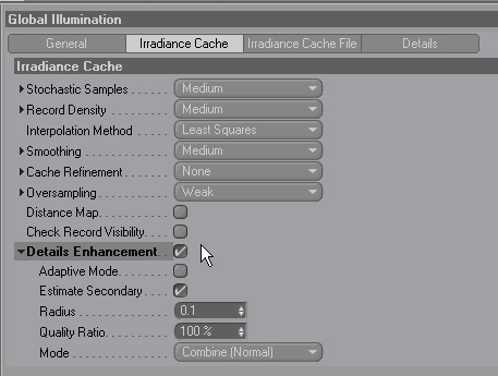 Image_34 Details Enhancement is an option that uses the QMC method to render finely detailed areas. There is a slight render hit which can increase some scene render times by as much as 50%. The result can be similar in appearance to ambient occlusion except that it is restricted to the GI solution, where it should be. Unlike AO it appears to add some additional bounce lighting even when rendering at diffuse depth 1, which adds a subtle beveling effect. A radius setting lets you increase the visible radius of the enhancement, but only within a very small range. As the radius increases, noise may become noticeable in extreme close-up, in which case you should likewise increase the Quality Ratio setting. Although it is said to render its area of influence in a physically correct way, perhaps because of the sometimes sudden differences with areas outside its influence, the effect can sometimes seem as if the outlines of detailed areas are overly accentuated, with no way currently to fade its overall strength. . Estimate Secondary: This switch estimates the result that higher diffuse depths would have on the Details Enhancement if fully calculated. It is fast and I have yet to see a difference in result. I recommend leaving it on.