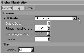 Image_37 Sky Sampler is a special GI mode that samples an HDRI mapped image placed on a Sky Object. This mode can render an HDRI scene very quickly with nice detail, but is unfortunately limited to just one diffuse depth which means you will not be able to get any bounce light from it. It can also be used with Cinema's newly enhanced procedural sky (also called Sky). However, because of the single diffuse depth limitation, and because it cannot save or reuse a saved cache, one of the AR modes is probably the better choice when rendering procedural skies. Below (Image_38) are two Sky Sampler renders done with different HDRI images: