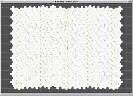 | The above extrude settings will make each piece 10 inches deep with closed ends (caps) and a rounded edge bevel on top. (If you use Jeff's puzzle set the rounding radius to at most 1.1 in) After extruding the splines you will have a new object group containing 350 (400 for Jeff's puzzle) polygonal objects which are the pieces of our puzzle. In flat shading mode it should look something like the picture below. | |||||||||||||||||||||||