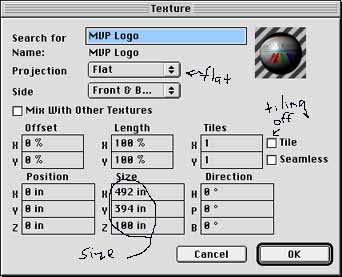 | Next apply the Material to the object group Puzzle Pieces and set your texture settings as follows: Choose projection type Flat so that the texture doesn't wrap around the pieces. Turn tiling off so the puzzle ends at the edge of the image. Enter the image size based upon the size of the image file in your material. (If you don't do this step the image will stretch to a square and the proportions won't be correct unless your image is perfectly square.) | |||||||||||||||||||||||