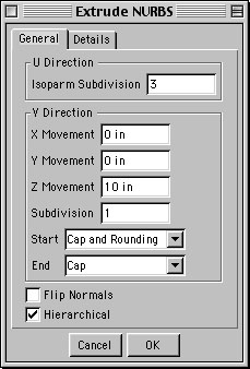 | Double click the Extrude NURBS icon to open it's dialog. There are two pages of dialog. Change the settings as shown below. | |||||||||||||||||||||||||||||||||||
